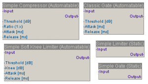 This SE module contains 19 different dynamic processors (gates, limiters, compressors), that can be found in the Delphi ASIO & VST open source package. On request all these processors can be modified to support a sidechain input and more than one input/output channel for more complex settings.